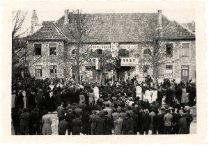 Dom ljudske prosvete v prvih povojnih letih. Stekla v oknih so razbita, na dvorišču se gnete množica ljudi, na balkonu je govornik. Ni znano, kaj se je dogajalo prav na tej fotografiji, vemo le, da so se v tem burnem obdobju pričele prve redne kinopredstave.
