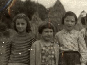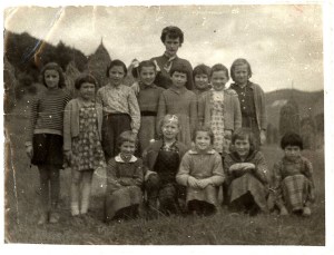 Za razredom je njiva zdeta z ostrnicami. Torej je slika nastala v času košnje, a dekleta so kljub temu v dolgih rokavih. V ozadju povsem levo je vznožje Ulake.