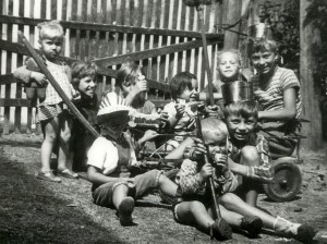 Na našem vrtu, to je na našem dvorišču, je bilo vedno živahno. Leta 1959 je moja sestra z mojim fotoaparatom posnela to sliko. Na njej smo slikani otroci iz sosednjih hiš.