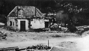 V času nastanka slike je bil Pocinov ovinek še precej oster, primeren za takratni promet. Zdaj je bolj zaobljen.V tistem času so v Pocinovi hiši živeli še štirje ljudje: Maks in Dano ter dve sestri. Zdaj je hiša prazna.Hiša na desni je Cinglova. Nekoč je bila v njej tudi kovačija, saj je bil Cinglov oče dober in daleč naokoli priznan kovač. Cinglov Lojz — Lojze Šparemblek, kovačev sin, je na “Golanu” zgradil novo hišo.Najprej sem pomislil, da je pred ovinkom parkiran osebni avtomobil Topolino, vendar, ko sem pregledal razvoj tega Fiatovega modela, nisem več tega mnenja. Ne vem, za katero znamko, oziroma tip luksus avta gre? |