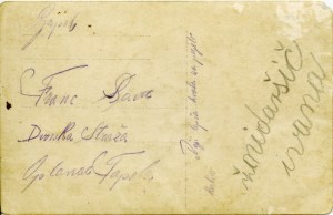 Čeprav nekoliko pozno, vendar sem šele danes opazil zgornjo fotografijo. Zanimiv je naslovnik, ki je očitno služil pri Dvorski straži / kraljeva garda???/. Kot kraj pa je navedena Topola, beseda pred njo pa je bila kot nečitljiva. Piše sicer Oplanac, kar pomeni Oplenac. Za boljšo razlago si lahko vsakdo prebere tudi na Wikipediji ali ustrezni strani opis za Oplenac, kraj, kjer je postavljen mavzolej rodbine Karadjordjević in kaj ta kraj, skupaj s Topolo, pomeni v srbski zgodovini. Morda samo zanimivost, da so pred dobrim letom,25. maja 2013, v tem mavzoleju pokopali posmrtne ostanke Petra II, kraljice Aleksandre, kraljice Marije in kraljeviča Andreja. Zanimivo bi bilo, kolikor se še da, zbrati podatke o povezavi te fotografije in naslovnikom.