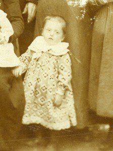 Pogled in kratko pristriženi laski dajo slutiti, da gre za dečka. Tudi dečke so v tistem času oblačili v kiklce. Ponekod niso imeli hlač vse tja do vstopa v šolo. Ta na sliki je z dvojnim, belim, velikim ovratnikom. Videti je, da se otrok v njej ne počuti najbolje. |