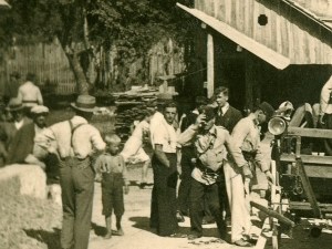 Del gasilne brigade iz Starega trga je na redni vaji. Iz potoka Brežiček črpajo vodo, čeprav se zdi, da je poletni čas vodni pretok že precej zmanjšal. Na prednjem delu vozička z brizgalno so po mostku napeljane brizgalne cevi.