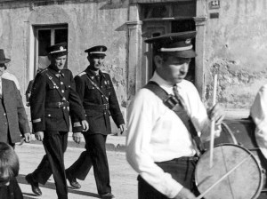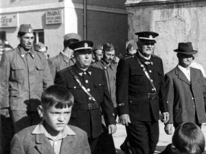 Slika prikazuje slavnostni sprevod, ki je bil del svečanosti ob praznovanju 70-letnice delovanja Prostovoljnega gasilskega društva v Cerknici.
