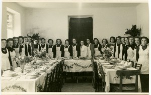 Udeleženke kuharskega tečaja, ki je potekal pozimi leta 1948 v Šerkotovi hiši v Cerknici, je neznan fotograf fotografiral ob okrašeni in pripravljeni mizi, na kateri pa so še prazni krožniki. Prazne so tudi steklenice in kozarci. Se vidi, da na tečeju ni bilo moških.
