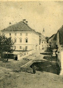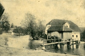 To je zagotovo Rutarjev mlin. V ozadju se vidijo kostanji pred Žajfenco, ki jih danes ni več. Kap strehe pa bi lahko bil od Cibkove hiše.