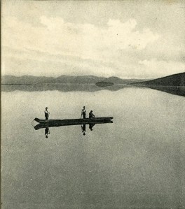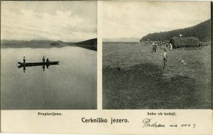 Postojnski fotograf M. Šeber je na razglednici sestavil dva ekstremna, a značilna prizora s Cerkniškega jezera.