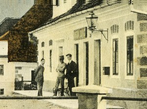 ![]() Pošta je bila na levi strani Bonačeve gostilne, nabiralnik je še danes na na vsaki pošti. Takrat so bili nabiralniki rdeči. Nabiralnik je na tej strani stavbe tudi že na starejši razglednici. |