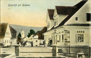 Razglednica prikazuje srednji del Begunj, z Bonačevo gostilno na desni strani. Na desni strani stavbe je bila Bonačeva gostilna, na levi strani pa so bili prostori pošte.