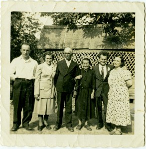 Neznan fotograf je leta 1950 fotografiral svate in poročni par pred drvarnico na Gogalovem vrtu na Mali gasi v Cerknici.