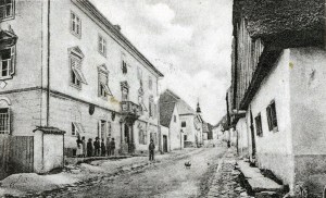 Po cesti so takrat še hodile kure. Na sodniji sta obešeni dve tabli z grboma. |