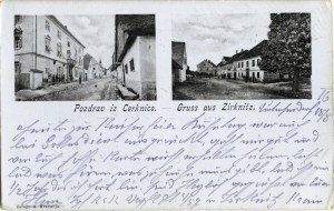 Dopisnica prikazuje dva cerkniška motiva, pod levim je podnapis v slovenskem, pod desnim pa v nemškem jeziku.