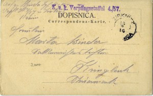 Opazoval in opazoval sem naslov Marte Binder, pa ga nisem iz tako nečitljive (vsaj za mene) pisave mogel razbrati. Dobri so poštarji, da so ga dostavili.Zgoraj je oddajni žig cerkniške pošte in prejemni žig K. u. K . Vepflegsstaffel 4./57., kar v dobesednem prevodu pomeni cesarsko kraljeva oskrbovalna eskadra 4./57.; saj so bili vojni časi in je bilo tudi civilno življenje podvrženo vojnemu režimu. |