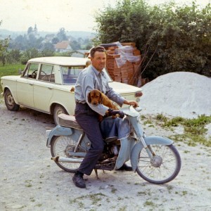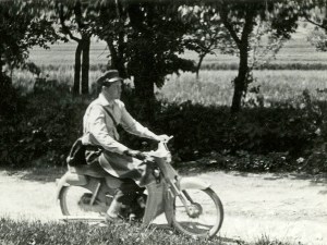 Na fotografiji je pismonoša Jože Meden na službenem mopedu. Neznani fotograf ga je ujel na začetku Bezuljaka. Fotografija je nastala koncem šetdesetih let.