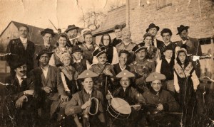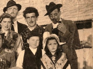 Slika je bila posneta spomladi leta 1948 ob premieri igre ” Naša kri” ob Prosvetnem domu v Begunjah. Vsi igralci so iz Bezuljaka, režiser pa je s Kožljeka.