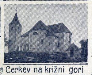 Na izrezu slike je cerkev sv. Križa na Križni gori. Tudi oblika same cerkve, če jo pogledamo s ptičje perspektive, je v obliki križa. Po ljudskem izročilu je bil na mestu, kjer stoji sedanja cerkev, prej velik križ. Ob njem so se verniki zbirali k molitvi. Nastanek prve cerkve sega v čas križarskih vojn. Prvotna cerkev je bila dosti manjša. Božjepotna je po letu 1743, ko so do nje postavili 13 kapelic križevega pota in blagoslovili slike v njih. 14. postaja je v cerkvi. Zaradi številnih romarjev iz različnih krajev so leta 1750 zgradili večjo, poznobaročno cerkev. |
