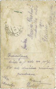 Razglednico je najbrž založila Franja Bratok. Mariji Drobnič — Gočevi, ki je bila usmiljenka v Radečah pri Zidanem mostu, sta jo poslali njena sestra Ivana in soseda Mici Anzeljc — Joštova. Sredi aprila, ko sta pisali razglednico, se je tudi na Blokah začelo delo na polju in usmiljenki je bilo najbrž dolgčas po domačih njivah.