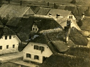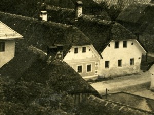 Lepo novo streho je imela tudi Enžakova hiša in kašča za njo, sosednja Srnelova z dvema mostovžema in brez dimnika pa že kaže rebra. Tudi te hiše ni več, danes je tam Froletova garaža.
