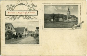 Tu pa je Kunc posnel hiše ob blatni cesti skozi vas. Pred sto petimi leti ljudje niso bili vajeni množičnega fotografiranja in so bili veseli, da si je nekdo vzel čas in jih slikal. Zato so se Begunjci, nevajeni fotografiranja postavili počez čez cesto z živino in vozmi vred ter pozirali fotografu Francetu.
