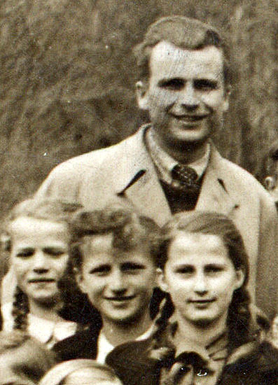 Zgoraj učitelj Jelatič, levo Kristina Kočevar (Podlož), desno Ana Petrič (Beli malen, Markovec)