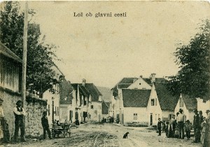 Lož ob glavni cesti. Rojstna hiša f. Milčinskega se skriva za ovinkom, tam nekje za zadnjo hišo v desni vrsti.