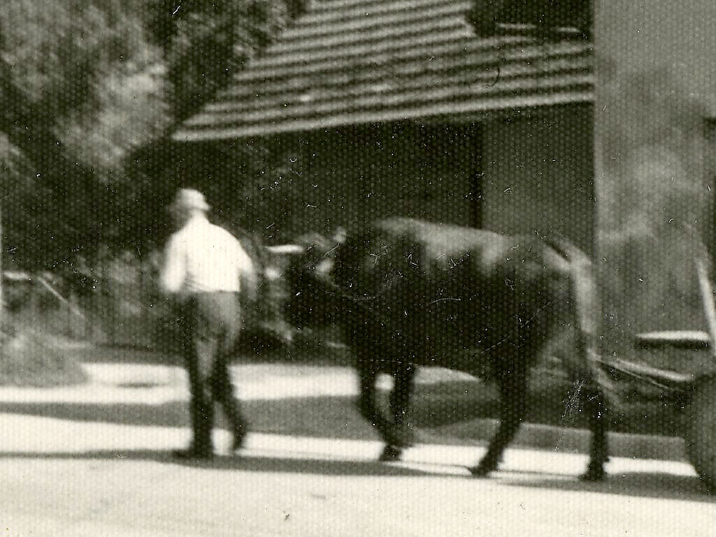 Štefan se je postavil na pločnik Gorjupove hiše in posnel Janeza Urbasa, po domače Kramarjevga Janeza z Male gase, ko gre z volom, zapreženim v voz proti domu. Janezov dom je na Mali gasi, nedaleč od kraja nastanka te fotografije.