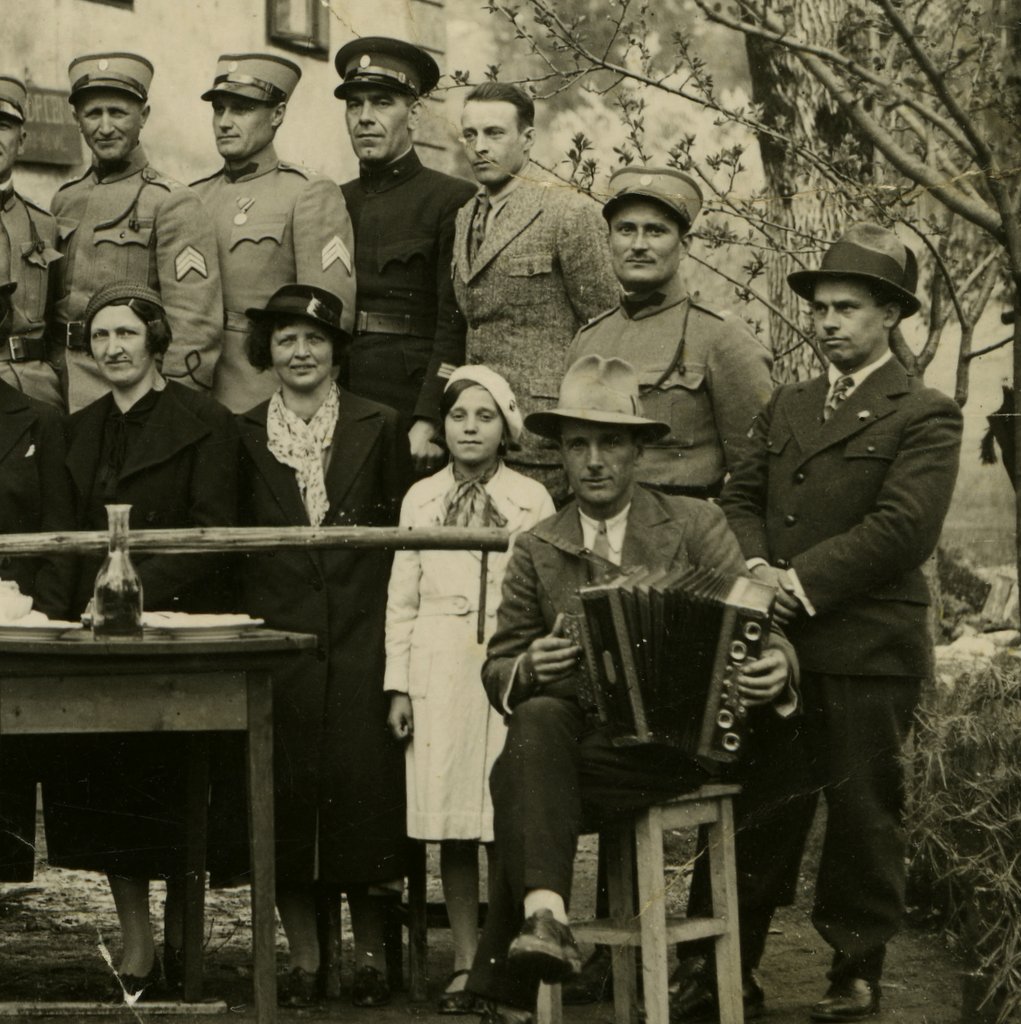 Moški v črnih uniformah so bili financarji v svetlih pa žandarji oziroma orožniki.Ženske v klobukih so bile njihove žene.