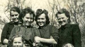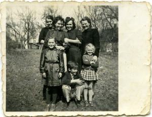Takole nasmejani smo se postavili pred fotografa sosedje različne starosti. Kdo ve kateri fotograf je zašel na Rudolfovo kar takole navadno nedeljo popoldne, kar sklepam po oblekah, ki niso najboljše (zahmašne) in tudi ne delavniške. Po drevju sodeč, ki nima listov sklepam, da je bilo to pomladi, prav gotovo pa leta 1955.