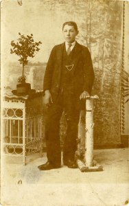 Birmanec Alojz Koščak, Rakek 22, rojen 29. 06. 1898, umrl 2. 04. 1983. Posnetek je nastal leta 1915 ali 1916, ko je imel Alojz 17 oziroma 18 let. Slika je bila posneta v fotografskem studiu, kjer je fotograf postavil portretiranca z lepo urejeno frizuro, s kravato, lajbičem, verižico in uro ter suknjičem.