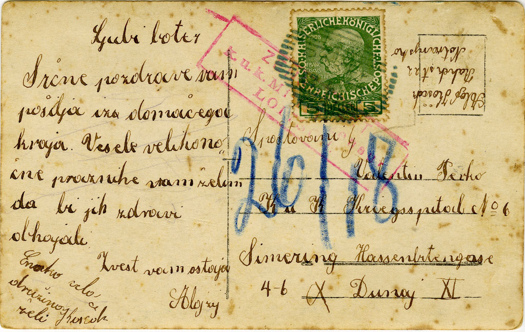 Včasih je bila navada, da so osebne, družinske in podobne fotografije uporabljali tudi kot razglednice. Tako je nastala razglednica, ki jo je birmanec Alojz Koščak poslal svojemu botru Valentinu Perku v vojno bolnico na Dunaju.