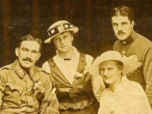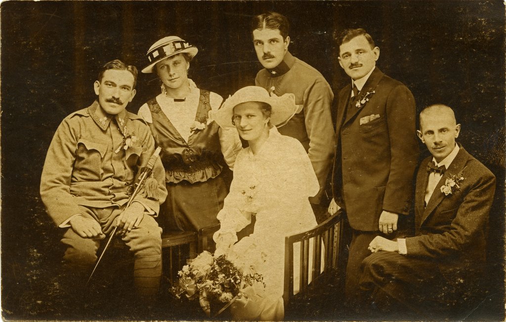 “Poroka sestrične Ide s Kurinčičem v Mariboru ob Dravi, 24. julija 1916“, piše z lepo ležečo pisavo na hrbtni strani slike. Zapisovalec se je tudi podpisal, žal ne čitljivo. Datum dogodka bi lahko namignil, zakaj sta kar dva moška v vojaških uniformah, a neukemu bralcu ostaja skrivnost kakšen je bil njun vojaški čin in rod vojske oziroma služba, ki je zahtevala uniformo. Morda sploh nista bila oba vojaka, ampak kaj drugega. No, tisti s sabljo bi težko bil kaj drugega … Poroka pa se je vsekakor zgodila med prvo svetovno vojno.