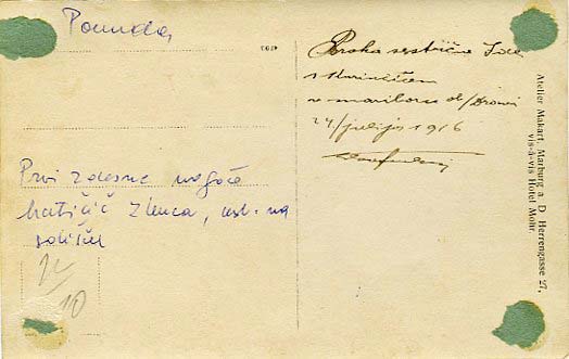 Zadnja stran fotografije je zelo zgovorna. Poleg napisa, ki sporoča datum in vrsto dogodka, sta na robu natisnjena tudi ime in naslov fotografa: Atelier Makart, Marburg a. D., Herrengasse 27, vis-a- vis Hotel Mohr. Hotel Mohr je nekaj časa deloval še po drugi svetovni vojni, kot pravi tast moje mariborske znanke, ki je po vojni tja s sošolci še hodil na pijačo. Na mestu tedanjega fotografskega ateljeja zdaj stoji hotel Zamorc oziroma kar ga je pač nasledilo … Enega od fotografov so pa Mariborčani po drugi vojni imeli Vetrinjski ulici nasproti Kina Udarnik, le lučaj stran od Gosposke in nekdanjega ateljeja Makart … Štirje modri madeži v vogalih slike so ostali od papirja, na katerega je bila slika nalepljena – ne vemo ali v albumu ali na samostojen karton.