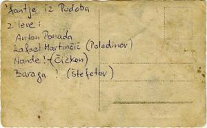 Sliko sem dobila pri Ponudovih v Pudobu. Na njej so pudobski fantje malo pred vojno. Kdo je sliko napravil ni znano, tudi ne vemo, kje natančno je nastala.
