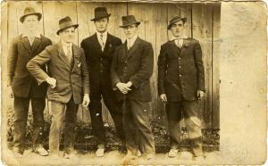 Kakšna priložnost je bila, ko so se slikali? So morda vrstniki, ki so šli na vojaški nabor? Vsi so v nedeljskih oblekah, vsi v klobukih in s kravatami, štirje imajo na reverju (nageljnov?) cvet in/ali drugačen, dodaten okras. Slikani so pred leseno steno iz desk, zadaj na tleh je videti rastline. Čevlji so videti prašni, a je temu lahko kriva le slabša kvaliteta slike. Dva fanta na sliki imata zanimivo ohlapno zavezani kravati – zaradi kroja ovratnika ali kar tako?