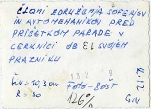 Slika je bila posneta v Cerknici pred spomenikom padlih borcev NOB na praznik šoferjev in avtomehanikov 13. 6. 1962. V ozadju je videti stavbo takratnega hotela Jezero, sedaj pa je tu SKB in v hotelski kleti gostišče Valvazor.
