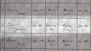 Na sliki je stran iz šolskega zapisnika za šolsko leto 1877/78, ko je Franc Jager obiskoval tretji razred.