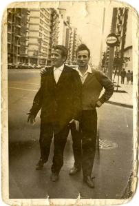 Le kdo bi vedel, kjer je fotografija nastala. Po avtomobilih v ozadju sodeč prav lahko kje v Združenih državah Amerike. Na fotografiji je Lojze Zbačnik najverjetneje s sodelavcem.