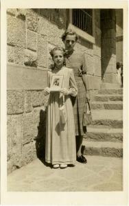 Sonce iznad Slivnice je obsijalo vzhodno pročelje cerkve na Rakeku in prav tako Slavko in njeno botro, očetovo sestro Julijano. Blago za obleko je poslala teta iz Amerike, kdo jo je sešil, ne vemo. Je pa Slavka lepa v njej. Pred seboj drži podobo z Jezusom, ki blagoslavlja otroka. Take smo dobili vsi. Bohved, kje je moja?!