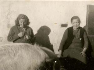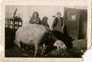 Slika je nastala za Poženelovo gostilno, pred štalo, še preden so prišli Taljani in vse požrli. In če je gostilna, mora biti tudi kaj za pod zob. Take debele svinje ni lahko zrediti. Ivana je bila podjetna, njena posvojenka Ana pa pridna, matranje je bilo pa vseeno.