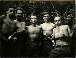 Na fotografiji je že vesela družba slovenskih vojakov korenjakov na Avali, vsi že zgoraj brez, s steklenicami vinca rujnega v rokah, pa tudi za pasom.