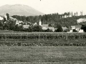 Redek pogled na Rakek z unške strani in prav lepo je videti gol hrib nad ajnšnitom.