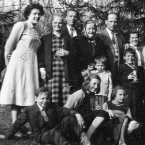 Vesela družba od najmlajših do žena in mož v najboljših letih in dveh seniork se mi je 1. maja 1958 takole postavila pred objektiv.
