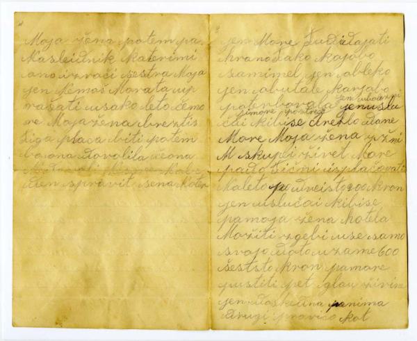 Kot vidimo, so oče, kljub kratki dvoletni šoli in težkemu trenutku, zmogli prenesti svoje misli na papir. Pustimo to, da niso prav vedeli, kje se rabi velika začetnica ali vejica, kaj se piše skupaj ali narazen in da so namesto pike uporabljali kar vezaj “jen” (in). Važno je bilo, da so zapisali, kako naj praktično teče življenje žene Ivane in sinov, če se ne bodo več vrnili iz vojske. Tudi slučaj morebitne nove poroke vdove je predviden, celo pogoji souporabe prostora v skednju od strani njihove sestre in svaka so zapisani. Nič olepšav, nič solza. Za notarja ali priče ni bilo potrebe ne časa.