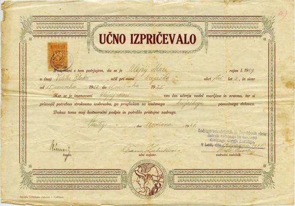 13 letni deček je z učenjem pričel po končanih šestih razredih osnovne šole v Novi vasi, jeseni 1922 in ga uspešno zaključil po treh letih, leta 1925. V začetku naslednjega leta so mu mojster Zabukovec, župan mesta Loža in načelnik Rokodelske zadruge v Ložu Hinko Sežon izdali potrdilo o končani učni dobi in ga proglasili za krojaškega pomočnika.