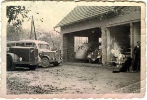 Slika je nastala poleti leta 1940. Neznani fotograf je slikal garažo z voznim parkom Meletovih. Podobno sliko smo objavili že v prispevku o avtobusih, ki so jih izdelovali pri Meletovih in so z njimi v naših krajih prevažali potnike in pošto.