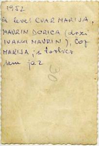 Na sliki, posneti 16. avgusta leta 1952, je mama Dorica Mavrin, Štodlova iz Novega Kota s štirimi otroki. Dva sta njena – deček v naročju in deklica s torbico – drugi dve deklici sta njeni nečakinji.