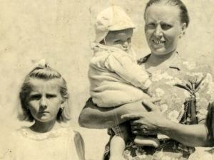 Mama Dorica drži v naročju sina Ivana, pod pazduho pa stiska torbico. Deklica Marija Cvar na levi je hči Doričine sestre.
