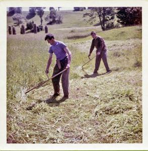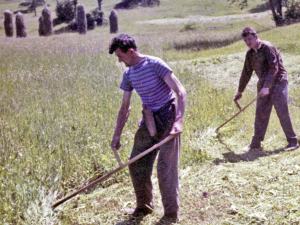 Gospodar in njegov zet kosita krmo za govedo, konje in ovce. V ozadju se je nekaj že suši na ostrnicah, ki veljajo za posebnost Loške doline, a so jih uporabljali tudi v Novem Kotu, prav tako kot v Loškem Potoku.