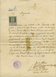 Z ozirom na odlok c. kr. sodišča v Logatcu z dne 18. 8. 1897 št. 3985, vsled katerega se ima Janez Bajt iz Unca št. 68 pri parceli št. 1542 vl. št. 226 k. o. Unec prepisati, konštatuje podpisano podžupanstvo na Unci kot gospodarski odsek, da je Janez Bajt kupil navedeno parcelo že pred več kot 30 leti ter dovoljuje odpis parc. št. 1542 od nje lastne vl. št. 226 k. o. Unec ter vknjižbo lastninske pravice na to parcelo novo sestavljeno vlogo na korist Janez-u Bajt iz Unca št. 68.