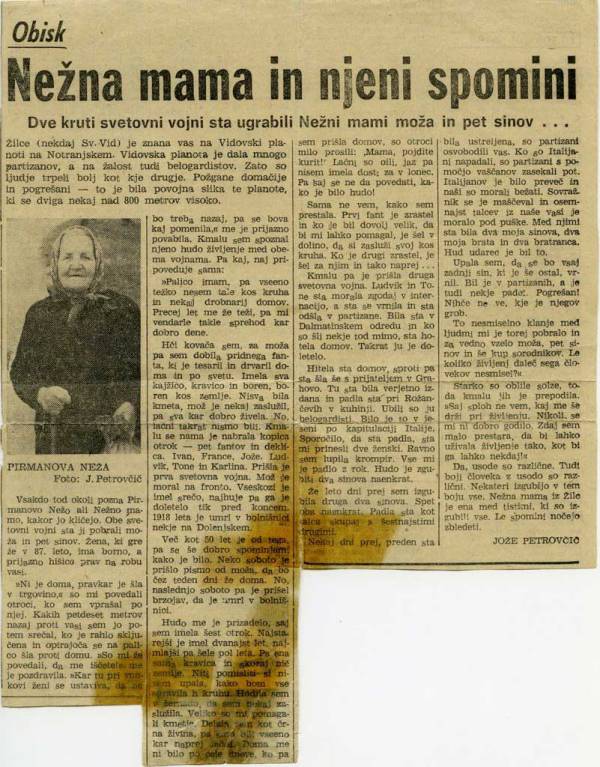Ob pogovoru z enim od njenih vnukov sem izvedela, da je bila težka življenjska zgodba Nežne mame pred leti objavljena v časopisu Delo. In tu se je aktiviral tudi moj spomin na nekoč viden časopisni odrezek. Toda, kje je to shranjeno? Prelistala sem vse knjige v hiši, ki jih sploh ni malo. In ko sem že skoraj obupala, se je pojavila kuharska knjiga moje mami in za njenimi platnicami tudi iskani članek.